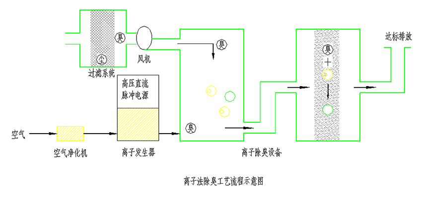 通过离子发生器装置,将空气中的氧分子分解成带有正负电的氧离子,利用氧离子(强氧化自由基)极强的氧化性,对硫化氢、氨气等有毒有害气体发生降解、氧化等复杂的物理和化学反应,从而达到除臭效果。并且利用正负离子的极性吸附恶臭气体中的悬浮颗粒物,达到净化空气,杀菌消毒的作用。